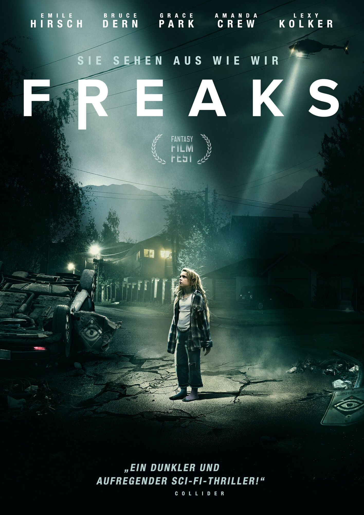 Der Sci-Fi-Thriller FREAKS – SIE SEHEN AUS WIE WIR begeisterte das Publikum bereits weltweit auf zahlreichen Filmfestivals. Wen wundert’s: Die Geschichte ist einzigartig unerwartet, das Schauspielensemble grandios. Emile Hirsch changiert in seiner Rolle als Vater virtuos zwischen Liebe, Verzweiflung und Härte, Bruce Dern überzeugt als zwielichtiger Mr. Snowcone. Doch die Jüngste in der Darstellerriege, Lexy Kolker, überstrahlt sie alle mit ihrer Darstellung der kleinen Chloe.